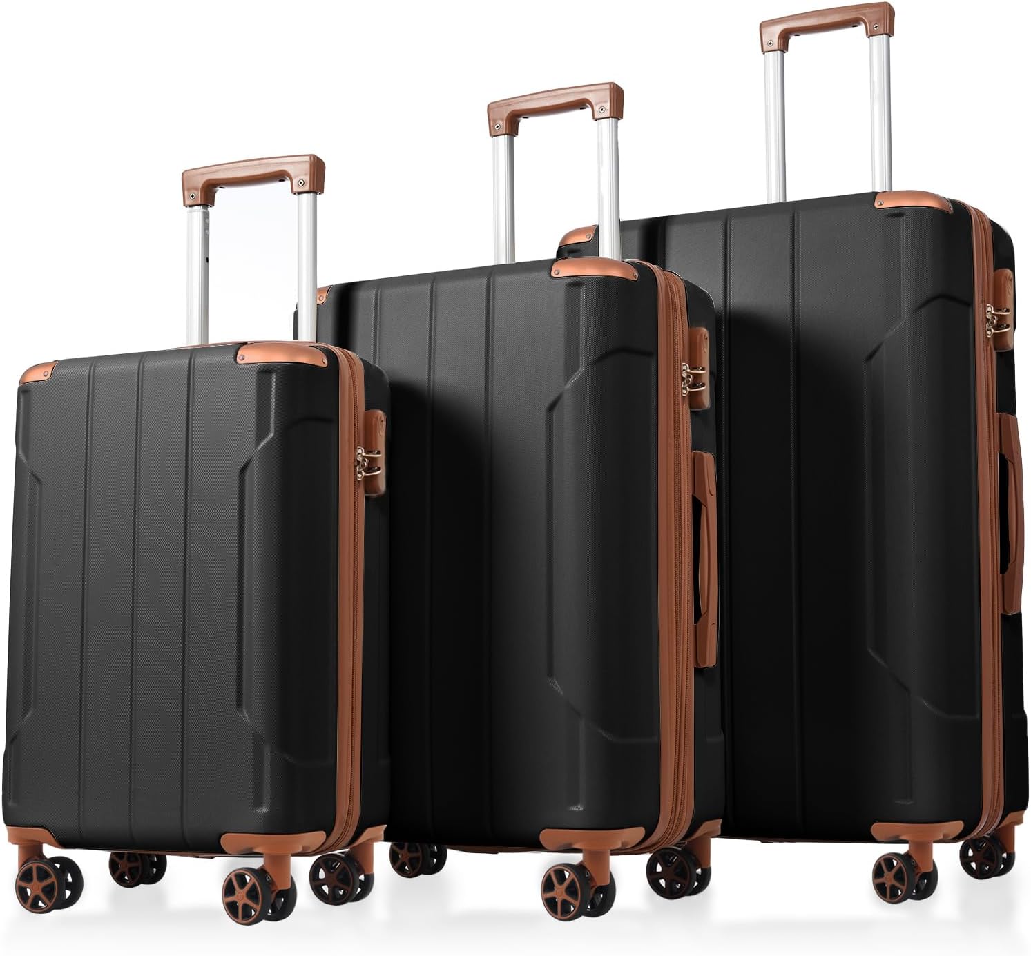 3 Piece ABS Hard Shell Suitcase Luggage Set with TSA Lock and Durable Corner Guards 8 Wheels Suitcase for Effortless Trave (Black and Brown)