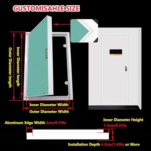 Struggling to conceal openings in your walls, ceilings, or floors for pipes, water valves, cables, or electrical fixtures? Discover the solution with our drywall access panel, designed to provide a discreet and secure way to access essential areas in lofts, basements, hospitals, hotels, and industrial buildings. **Specifications:** - **Material:** Durable Aluminum Alloy Frame + Gypsum Panel + Aluminum-Plastic Panel - **Aluminum Frame Width:** 20mm (0.79in) - **Inner Frame Height:** 1m (0.51in) - **Installation Depth:** 45mm (1.8 in) - **Customizable Width & Height** **Key Features:** 1. **Built-In and Invisible:** Seamlessly integrates into your walls, maintaining the aesthetic of your space. 2. **Custom Sizes Available:** Tailor the access panel to fit your specific needs, ensuring versatility for any project. 3. **Soundproof and Noise-Reducing:** Enhances the tranquility of your environment by minimizing sound transmission. 4. **Paintable Surface:** Easily paint the panel to match your interior decor, allowing for a flawless blend with your existing design. 5. **Versatile Applications:** Ideal for pipe wells, water meter boxes, fire hydrants, distribution boxes, fire doors, and inspection doors. **Package Includes:** - 1 × Access Panel **Please Note:** - Color variations may occur due to monitor settings and lighting. - Manual measurements may have a slight variation of 1-2 cm; actual size should be confirmed upon installation. Transform your space with our drywall access panel, offering both functionality and style while ensuring easy access to essential utilities.