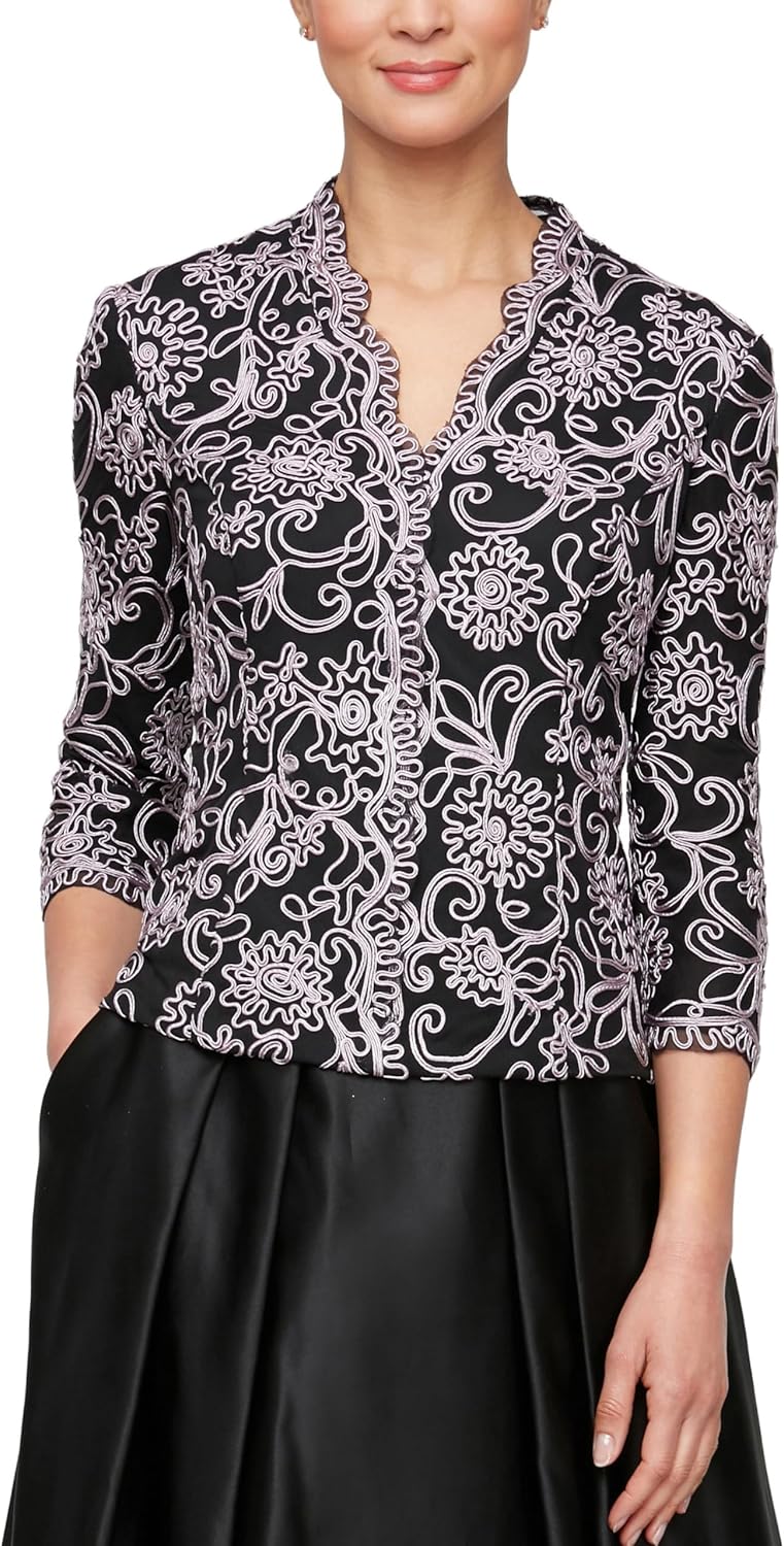 Elevate your formal wardrobe with the Alex Evenings Women's Stretch Embroidered Blouse, a sophisticated essential for any special occasion. This elegant top features exquisite all-over floral embroidery with a distinctive center front scallop detail that draws the eye and creates a flattering focal point. The decorative V-neckline and illusion sleeves provide the perfect balance of coverage and style, making it ideal for evening events, weddings, and cocktail parties. Crafted from premium stretch fabric, this blouse ensures comfortable movement all night while maintaining its structured elegance. Versatile and timeless, it pairs perfectly with Alex Evenings formal pants or skirts for a complete ensemble that transitions effortlessly from mother-of-the-bride outfits to holiday celebrations and formal dinners.