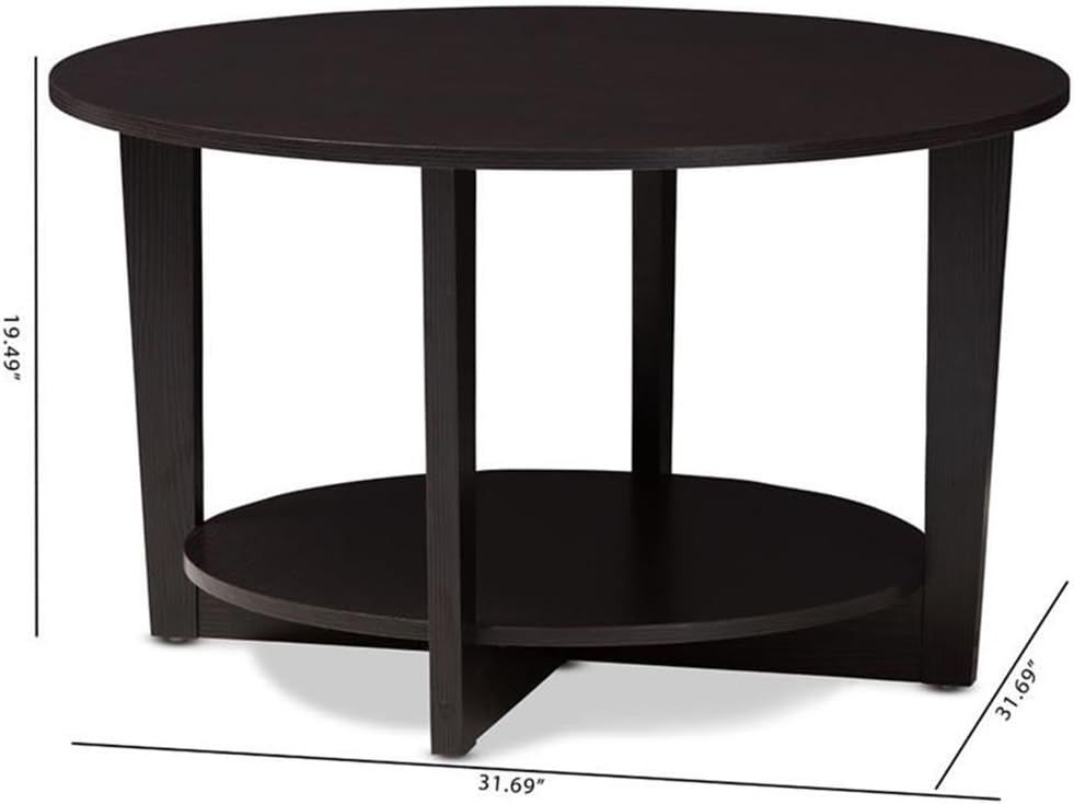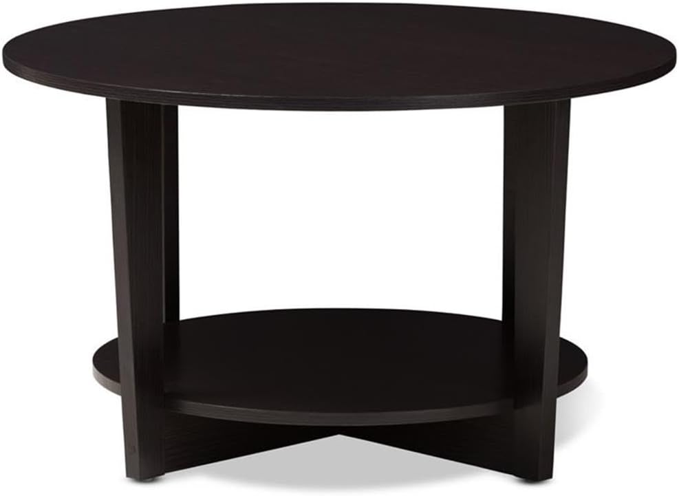 The Belina coffee table is the ideal way to bring the look of your livingroom together. The modern and contemporary-inspired design emphasizes clean lines and geometric shapes. The Belina is finished all over in a welcoming, wenge brown. The table features a smooth, circular table top, with a matching circular shelf underneath. The open space beneath the table top is ideal for storage or displaying decor, making the Belina a great option as an accent table. The legs of the table are slightly tapered and connect at the bottom in a symmetrical cross design. Made in Malaysia, the Belina requires assembly.Features Modern and contemporary coffee tableWenge brown finished woodCircular table topOpen space beneath the table top for storage or displaySlightly tapered legsAssembly requiredMade in MalaysiaDimensions: 19.49" High x 31.69" Wide x 31.69" DeepSET INCLUDES: One (1) Coffee TableSTYLE: ContemporaryMATERIAL: MDFCOLOR: Wenge Dark Brown
