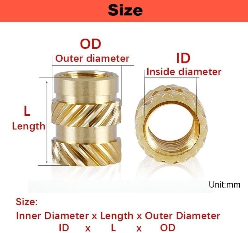 The press-in nut has good heat resistance and can be easily installed in the threaded tapered hole by ultrasonic or heating, or it can be molded during the injection process.Size:Inner Diameter (ID) x Length (L) x Outer Diameter (OD)Material: BrassUsed in: mobile phones, computers, various plastic casings, toys, clocks, communications, micro-motors, electrical appliances, electronics, toys, watches, lighting, locomotives and other industries.