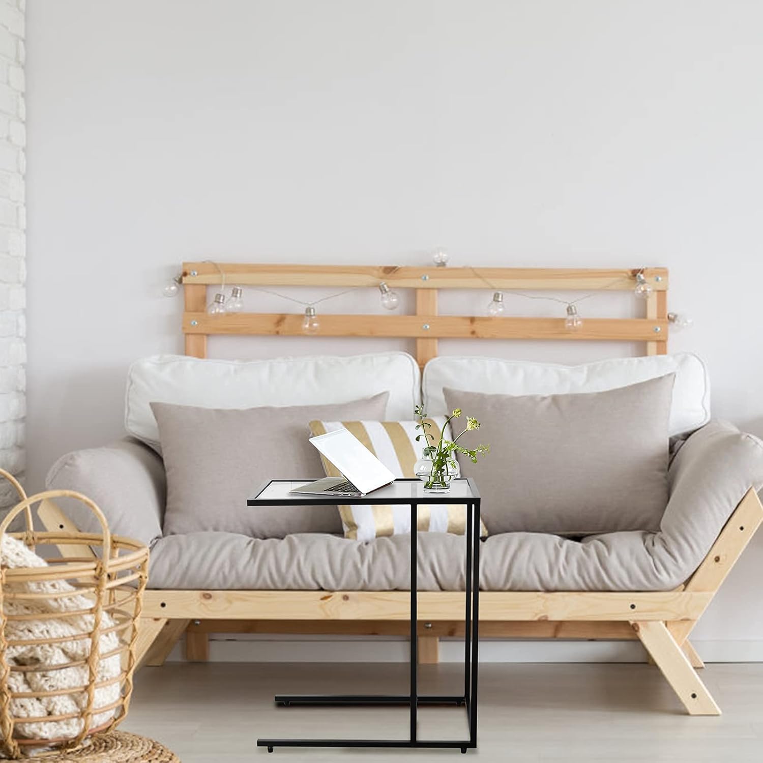 Description:Our side table creates a simple life for you, and allows you to enjoy quiet leisure time from the prosperity of the city and the fatigue of work.With modern style and simple appearance, this side table can perfectly match any scene, such as bedroom, living room, office, or outdoor places like balcony and courtyard. The solid metal structure allows you to place books, desk lamps, computers and other items on the desktop without shaking or toppling. At the same time, the anti-skid foot pad at the bottom can improve the stability and protect the floor. Therefore, do not hesitate to choose our simple but fashionable side table to make your home look fresh, and keep the items you want handy at any time.Features:Constructed with strong steel tube, offering good weight capacityMultiple use as sofa side table, snack table or nightstandSuitable for living room, bedroom, office, study room etc.Portable design with compact size and light weight, easy to move4 adjustable feet pads, add extra stability and avoid scratchesC shape for sliding into sofa or bed with ease, use it at any timeIndustrial outlook and simple style increase the texture of your roomGlass tabletop and smooth surface, easy for your daily cleanSpecification:Color: BlackMaterial: Tempered Glass + SteelOverall Dimension: 14” x 22” x 26” (L x W x H)Steel Pipe Diameter: 0.5”Net Weight: 9lbsPackage includes:1 x Side End Table1 x Instruction