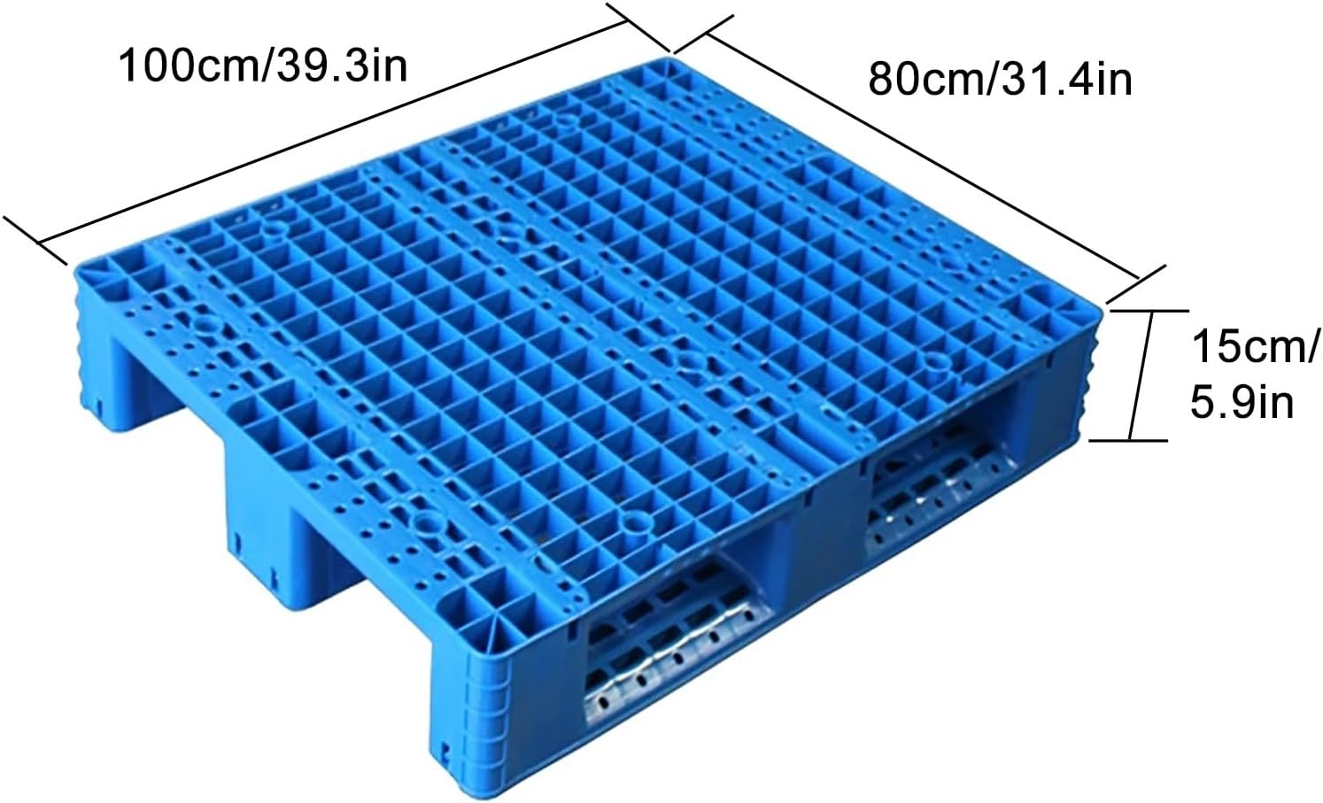 Features:Thanks to its breathable grids, the plastic grating pallet ensures efficient air circulation, preventing moisture buildup that could break your goods, safeguarding the quality of your items, Plastic floor pallet is engineered with the 4 way entry designSpecifications:Name: Plastic PalletMaterial: PlasticColor: BlueSize: 100x80cm/39.3x31.4in , 110x80cm/43.3x31.4in , 110x90cm/43.3x35.4in , 110x100cm/43.3x39.3in , 110x110cm/43.3x43.3inLoad-bearing capacity: static load-bearing capacity: 4 tons, dynamic load-bearing capacity: 1 tonsPackage includes:1 x Plastic pallet
