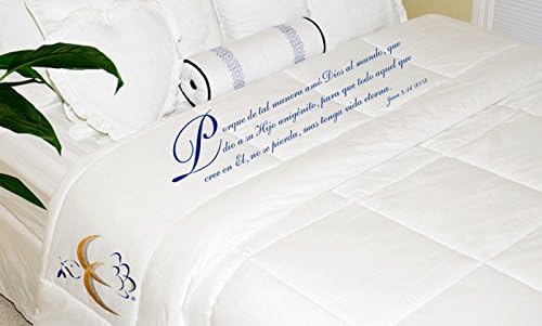 Embroidered on the front of the comforter: "For God so loved the world, that he gave his only begotten Son, that whosoever believeth in him should not perish, but have everlasting life. John 3:16" Comfort Coverings luxurious comforters are made of 100% sateen cotton, beautifully embroidered with some of the most cherished and recognized Bible verses. Queen comforter set includes 1) 93" x 100" comforter and 2) 2 standard pillow shams 20" x 26" white in color.