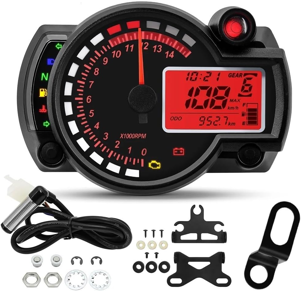 Before purchasing, please make sure the product size is suitable for your motorcycle vehicleSpecifications:Made of ABS plasticColor: blackSize: 140 * 99mm / 5.5 * 3.9inSpeed Sensor Cable Length: approx.125cm / 49.2inSpeed Sensor Size(L * D): 40 * 12mm / 1.6 * 0.5inWorking Voltage: DC 12VSpeed Display Range: 0~299km/hOdometer Display Range: 0~99999.9kmTrip Meter: max.999.9kmGear Position: 1 to 5Backlight Color: nomally color is blue, 7 colors adjustablePackage Includes:1 * Motorcycle Tachometer