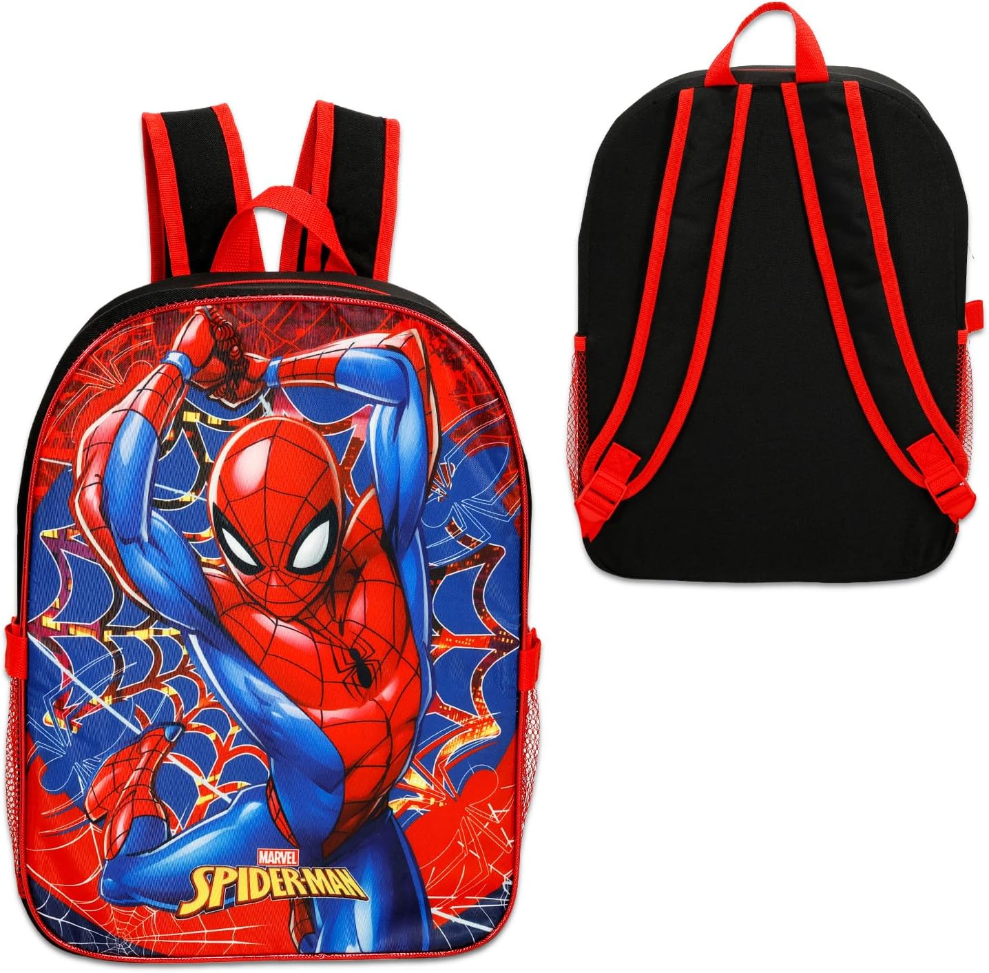 Spiderman Backpack with Lunch Bag for Boys - Bundle with 16" Marvel School Bag, Lunch Box, Stickers, Water Bottle, More | Spiderman School Backpack Set. This Spiderman backpack measures approximately 16" x 12" x 5" and features padded adjustable shoulder straps, zippered compartment, and top loop for hanging. This Spiderman school supplies set also includes an Spiderman lunch bag, ideal for keeping food fresh all day long. This Spiderman backpack set also includes a Beach Kids water bottle, Spiderman stickers, and a Beach Kids superhero door hanger! Suitable for any fan of Spiderman. Caution: Entanglement Hazard. Keep away from very young children. Do not place around neck.