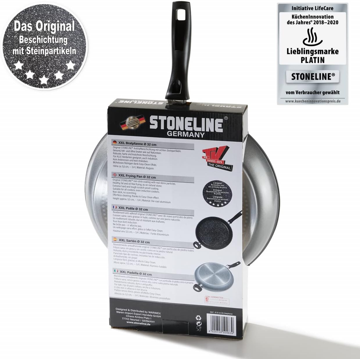 STONELINE - The original! Healthy nonfat cooking and frying Cooking XXL - with this 32 cm, frying pan you are perfectly equipped for any hunger. Thanks to the premium nonstick coating nothing burns and nothing sticks in this induction-suitable pan. No need to add fat or oil - enjoy your food lowfat!1 frying pan, &o-slash; approx. 32 cm, height: approx. 5.5 cm, approx. 3.4 l The most important advantages of STONELINE cookware at a glance: Scratch-proof non-stick STONELINE coating Perfect results and crispy meat Perfect taste Vitamin-friendly cooking and frying without fat and oil No burning and no sticking Super easy to clean Suitable for all cookers including induction cookers Extra strong, non-distorting base thickness 4.5 mm This product is oven-proof up to 180 & Material: die-cast aluminum Tips for cleaning and care We recommend cleaning your cookware thoroughly with water and a mild detergent before the first use. Apply a few drops of cooking oil with a kitchen towel onto the coating. No fat or oil is needed for further use! Thanks to the Easy-Clean effect we recommend cleaning the cookware by hand. Wipe clean with hot water, a mild detergent and a soft sponge.