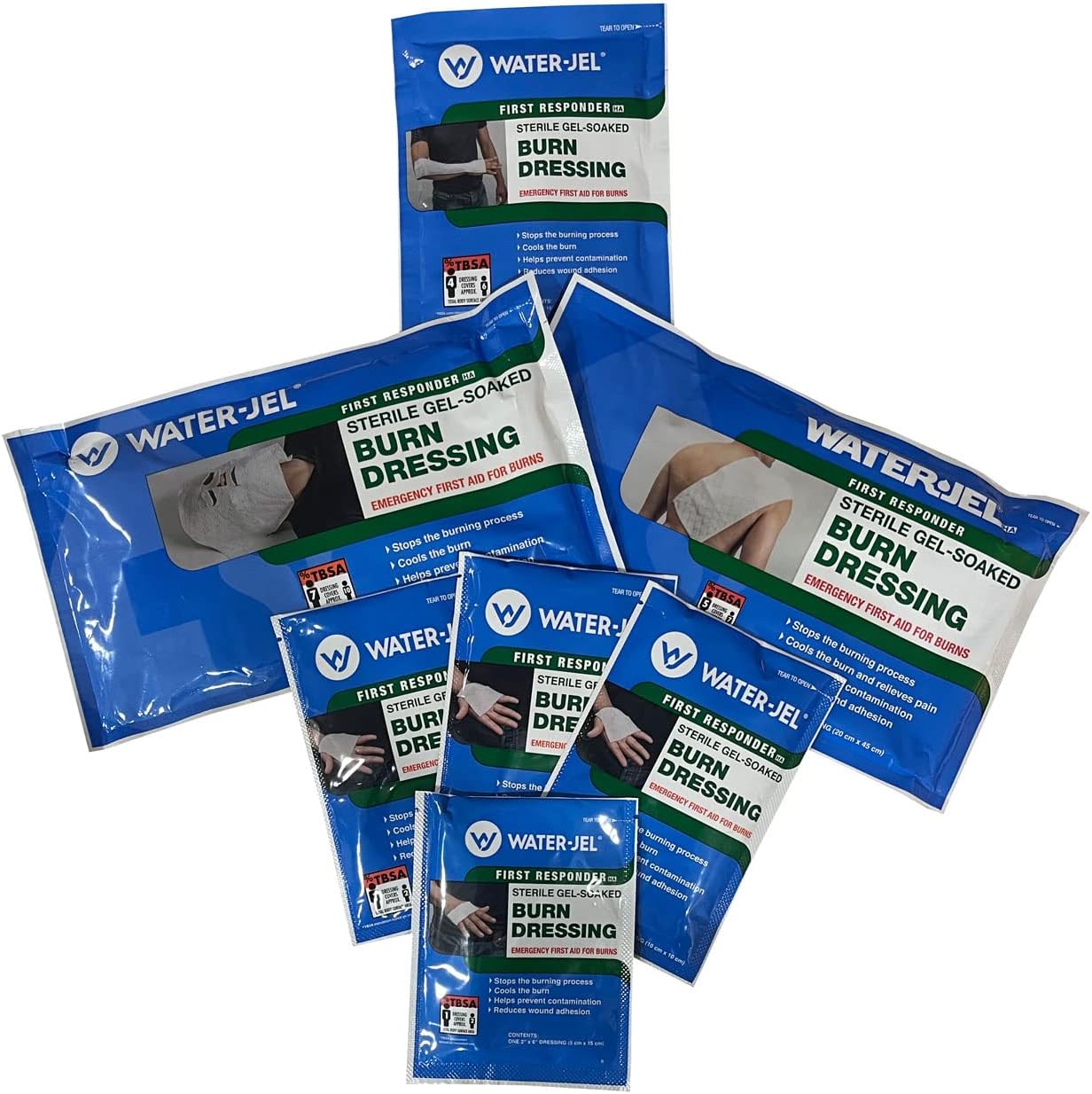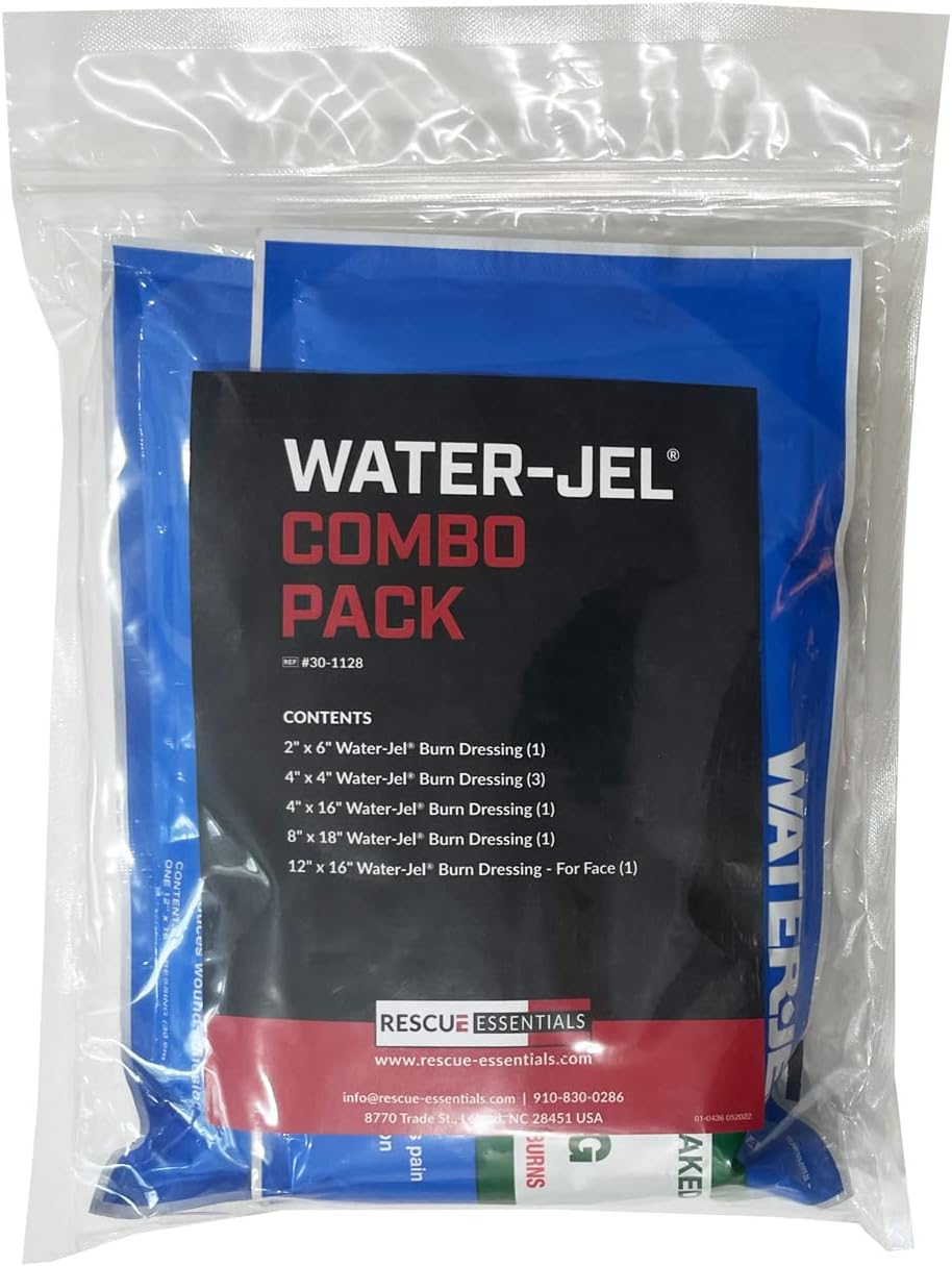 The Water-Gel Combo provides an assortment of burn dressing to address a broad range of possible burn injuries. All dressings in this combo are sterile, foil-packed, and made of gel-soaked, medical-grade non-woven material. These dressing use Water-Jel's latest updated formula. The dressings include three 4" x 4" dressings, excellent for hand burns and other small-area burns. A 2" x 6" dressing is designed to wrap around a wrist, between the (to keep them separated), or for the inner arm, foot instep and similar areas. There is a 4" x 16" dressing suited for the inner or outer area of the forearm, and can be used on a portion of the leg or to wrap a foot.The largest burn dressing is 8" x 18" - excellent to cover sizable areas such as the thigh, shoulder or back area, and large enough to wrap around the bottom portion of the leg or the thorax area. Also included, a 12" x 16" dressing made specifically for facial burns, with nose, mouth and eye slits and eyelids flaps. It is large enough to protect the entire face, ears, neck and part of the head.